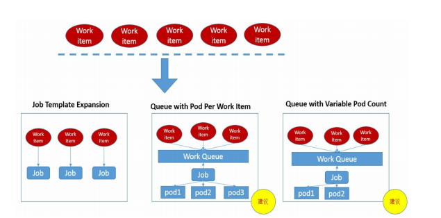 采用一个任务队列存 放Work item,一个Job对象作为消费者去完成这些Work item,但与上面 的模式不同,Job启动的Pod数量是可变的