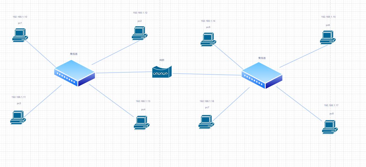 集线器能够承载的网络数量是有限的,为了能够承载更多的网络,可以使用网桥设备连接集线器。