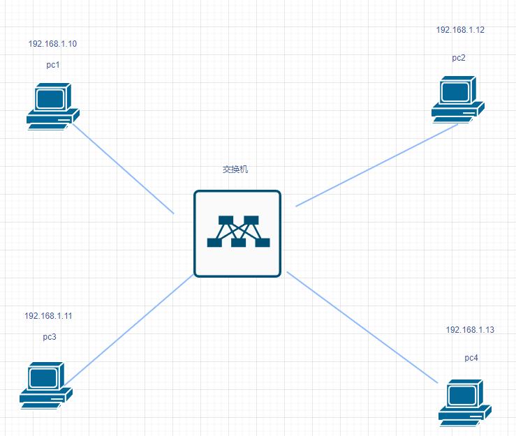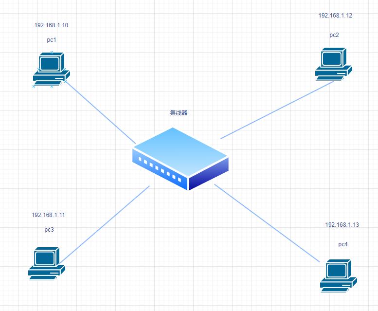- pc1 拿到pc4 的 mac地址后,发送IMCP协议请求到集线器,集线器发送所有路径 (pc2,pc3,pc4),其他非目标地址的pc 执行丢弃,什么也不做,只有pc4,执行响应,再发送数据到集线器