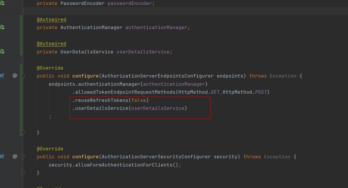 //没有刷新的 if (refreshToken == null) { refreshToken = createRefreshToken(authentication); } // But the refresh token itself might need to be re-issued if it has // expired. else if (refreshToken instanceof ExpiringOAuth2RefreshToken) { ExpiringOAuth2RefreshToken expiring = (ExpiringOAuth2RefreshToken) refreshToken; if (System.currentTimeMillis() > expiring.getExpiration().getTime()) { refreshToken = createRefreshToken(authentication); } }
