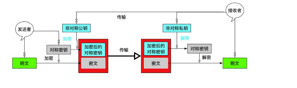 - 数据进行传输 ,传输了2个数据,一个是用对称秘钥加密的数据,一个使用非对称加密后的 对称秘钥。也就是说对称秘钥 通过 非对称加密的方式加密传输过去了。