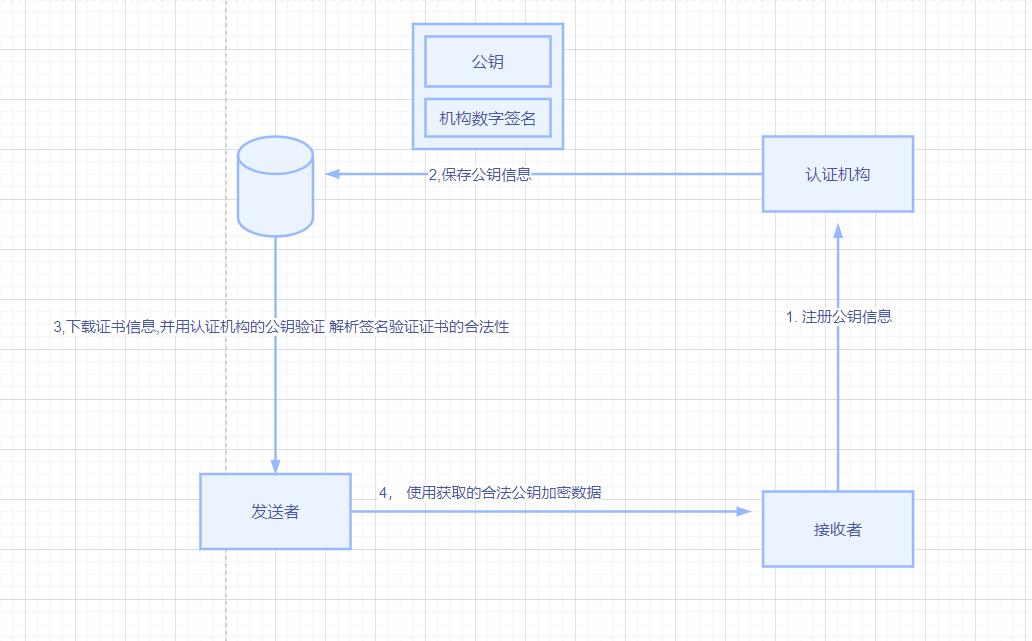- 数据接收者向认证机构注册公钥信息或者在认证机构生成公钥和私钥信息,然后将私钥下载下来。