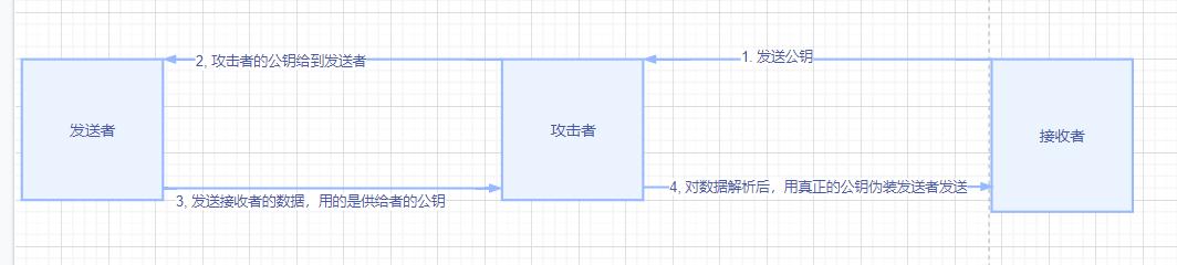 拦截者 将 消息接收者发送给 消费发送者 的公钥拦截下来保存下来,然后将自己的公钥发给消息发送者。冒充消息接收者的身份进行消息的传输,达到攻击的目的。