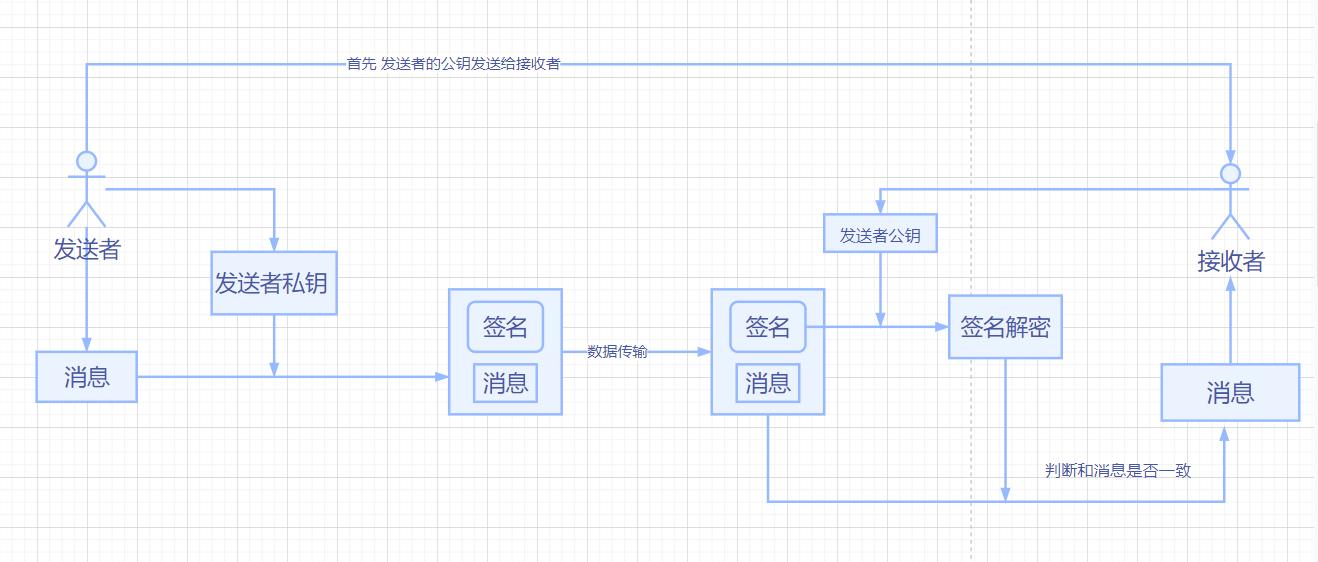 为了验证数据传输中数据是否被修改的问题,引入了数字签名,通过发送者的私钥加密消息,使用发送者的公钥解密消息验证数据是否被修改过。