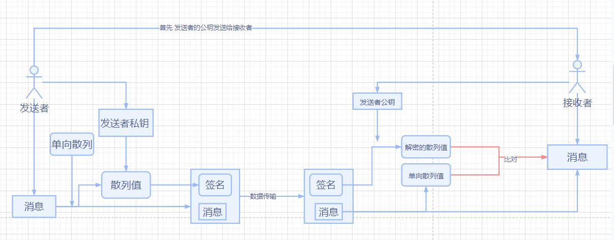 - 解密的结果和消息进行比对,如果一值说明消息未被修改,如果不一致说明消息可能被修改或不是发送者发送的。