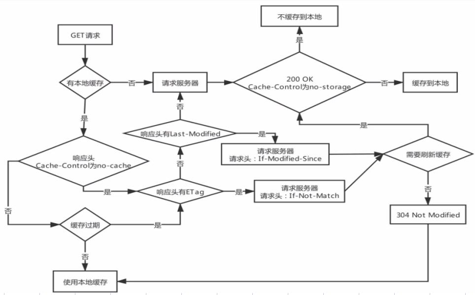 - 浏览器发送GET 请求,如果本地有缓存,就检查本地缓存的响应头,如果响应头的cache-control 为no-cache,表示需要再请求下服务器判断缓存是否有效。依次根据是否有Etag 和Last-Modified 来请求服务器来判断是否需要刷新缓存。