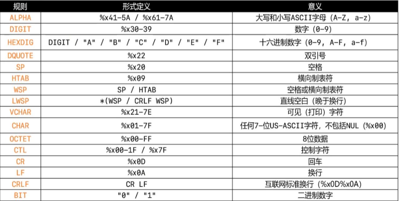ABNF ( Augmented Backus-Naur Form) 增强的巴克斯-瑙尔范式。
