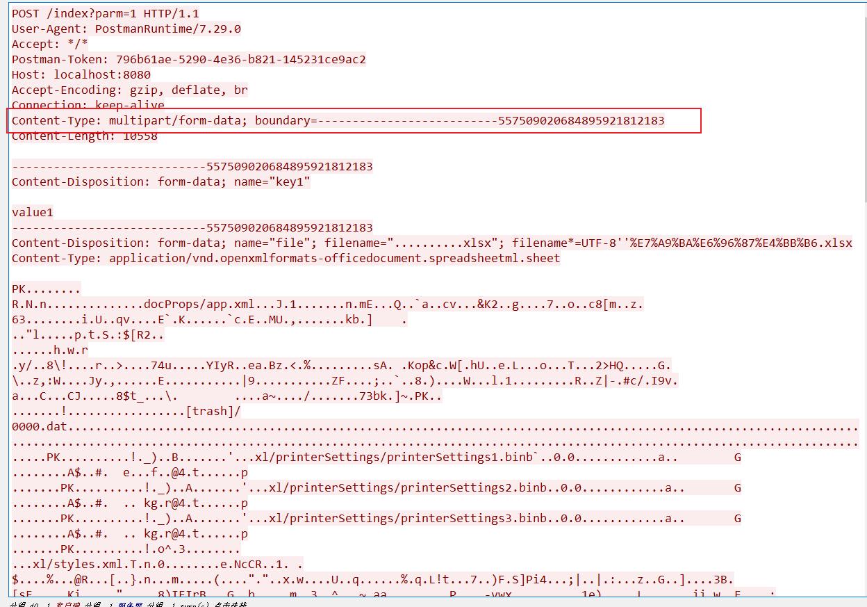注意每个请求的 boundary 的值是不同的。boundary 表示分界值。