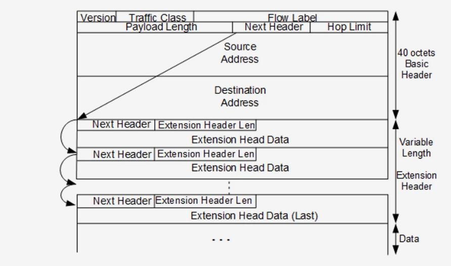 找到第一个拓展头部的时候,通过这个拓展头部的Next Header 去获取下一个拓展头部的类型,如果有就接着解析,如果类型是 TCP ,UDP ,ICMPv6 ,那么就说明接下来的数据已经不是拓展头部了,是上层的数据,属于当前层的数据部分。