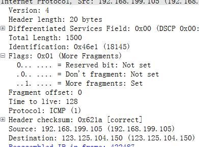 并且可以看到 fragment offset 数据包的字节偏移。 flags 查看是否是最后一个数据包。