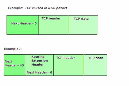 example1 是没有拓展头部,example2 是有一个拓展头部,接着就是tcp数据部分。具体的nextHeader 的值的类型可对照上面的表查看。