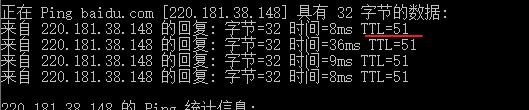 得到的TTL是 51,那么可以得到到百度的服务中转了14个左右的路由器。
