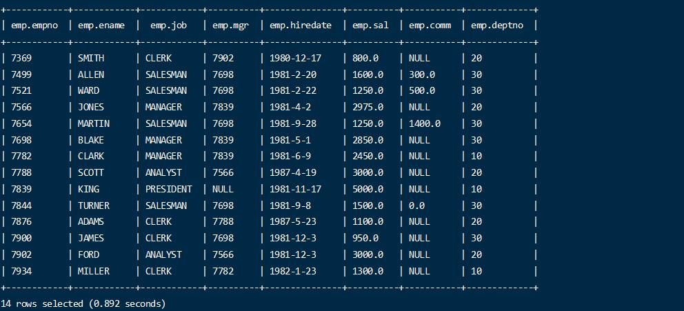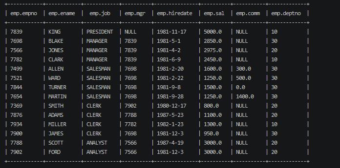 +————+————+———-+———-+—————+———-+———–+————-+ | emp.empno | emp.ename | emp.job | emp.mgr | emp.hiredate | emp.sal | emp.comm | emp.deptno | +————+————+———-+———-+—————+———-+———–+————-+