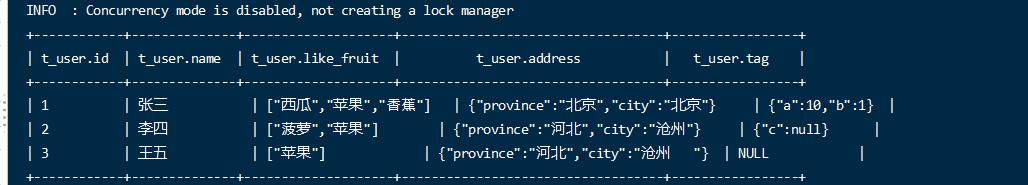 1 | create EXTERNAL table t_user(id int,name string,like_fruit array<string> ,address struct<province:string,city:string>,tag map<string,int> ) |