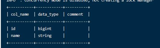 1 | create table if not exists user_info(id BIGINT,name String) comment 'user info'; |