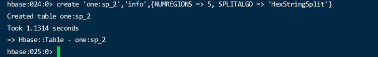 1 | create 'one:sp_2','info',{NUMREGIONS => 5, SPLITALGO => 'HexStringSplit'} |