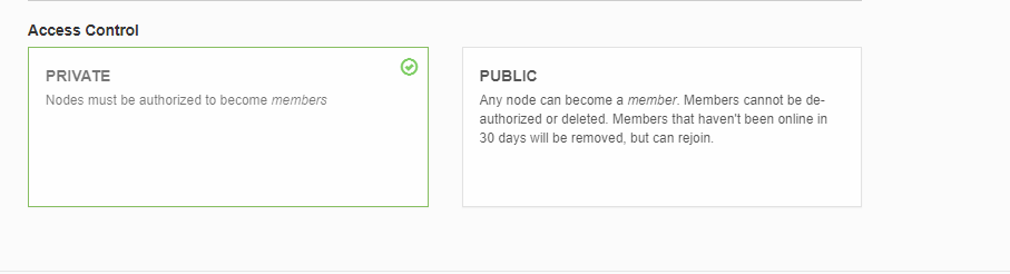 访问控制,可以选择私有网络和公有网络,如果是私有的,当有设备连接的时候,需要在页面上进行审核通过才能连接,而公有的不需要。为了安全性,建议还是私有网络