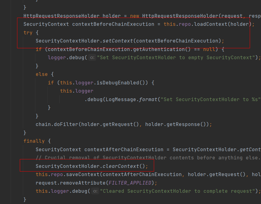 SecurityContextPersistenceFilter 此过滤器的主要作用就是在请求前从 SecurityContextRepository 中 ,获取到认证信息放到 SecurityContextHolder 中,请求的最后同时将 SecurityContextHolder 中的认证信息清空。