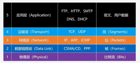 在2个主机中进行数据传输的过程中,都要经过5层网络。不同的层具有不同的功能。