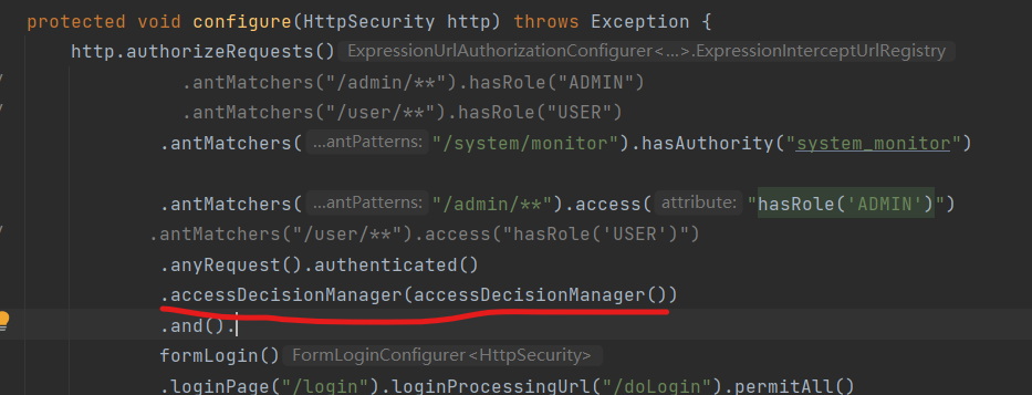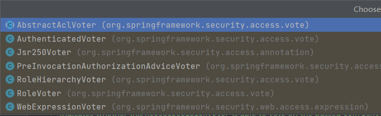 //遍历投票当只要有一个拒接,将抛出异常 int deny = 0; for (AccessDecisionVoter voter : getDecisionVoters()) { int result = voter.vote(authentication, object, configAttributes); switch (result) { case AccessDecisionVoter.ACCESS_GRANTED: return; case AccessDecisionVoter.ACCESS_DENIED: deny++; break; default: break; } } if (deny > 0) { throw new AccessDeniedException( this.messages.getMessage("AbstractAccessDecisionManager.accessDenied", "Access is denied")); } // To get this far, every AccessDecisionVoter abstained
