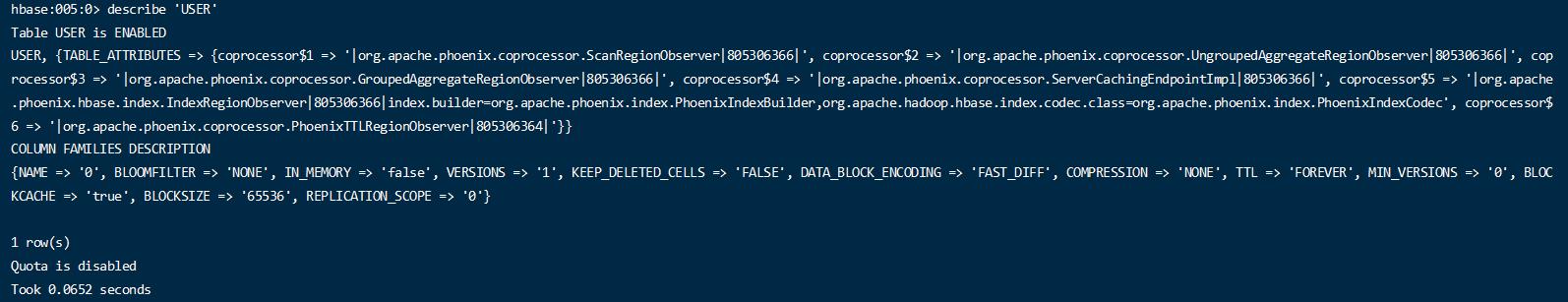 这里有一个很重要的参数 column_encoded_bytes。如果不开启此参数,那么在hbase生成的列将是一个被处理了的比较短的列明,当设置为0 的时候,表示不开启列名的编码,也就能保持两边的列名一致。