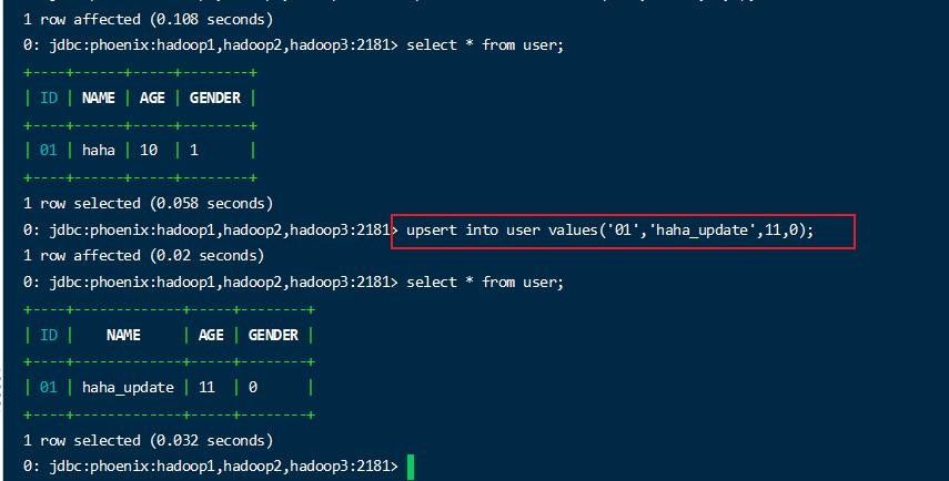 注意:和标准的sql不同的是,插入数据使用的是 upsert,不管是插入和更新都是使用此语句,如果根据主键已经存在那么则会覆盖。