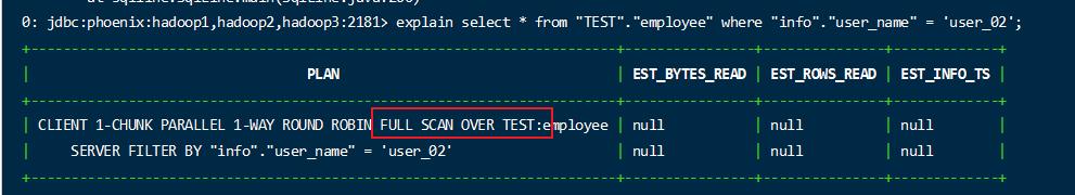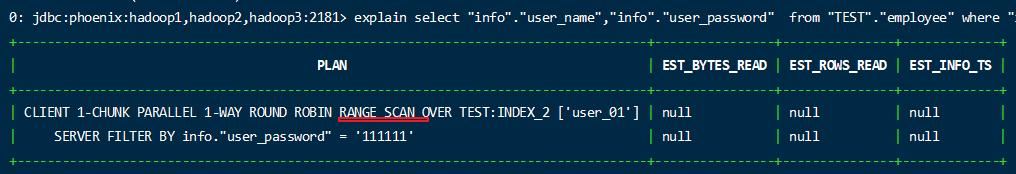 1 | explain select "info"."user_name","info"."user_password" from "TEST"."employee" where "info"."user_name" = 'user_01' and "info"."user_password" = '111111'; |